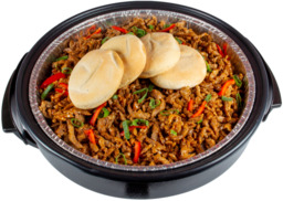 Gevuld met gekruide varkensreepjes met lekkere saus en party pita broodjes